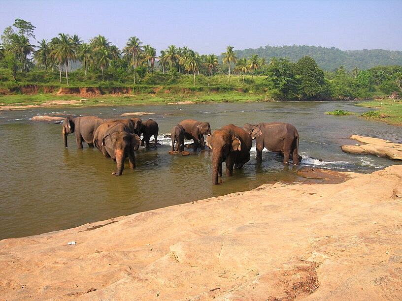 und den von Bambus gesäumten Riversite Drive am Mahaweli Fluss. Auf der Hängebrücke über den Mahaweli Fluss hat man einen sehr schönen Ausblick. An drei Seiten begrenzt der Mahaweli Fluss den botanischen Garten . Der Fluss ist mit seinen 332 Km der längste Fluss Sri Lankas. Er entspringt im Hill Country , fliesst durch weite Teile der Insel und mündet bei Trincomalee ins Meer. Er wird von 40 Nebenflüssen gespeist . Klick hier fuer mehr Fotos